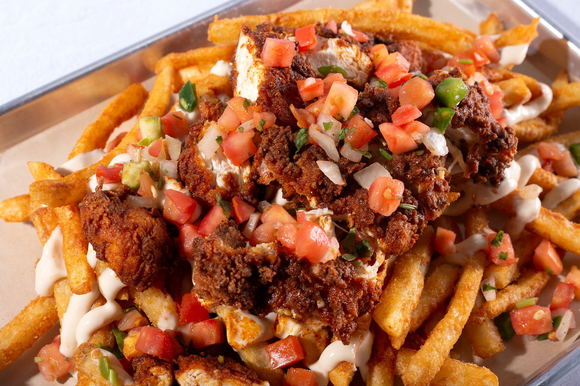 Dirty Bird Loaded Fries Entrees Cluck S Nashville Hot Chicken Restaurant In Meridian Id